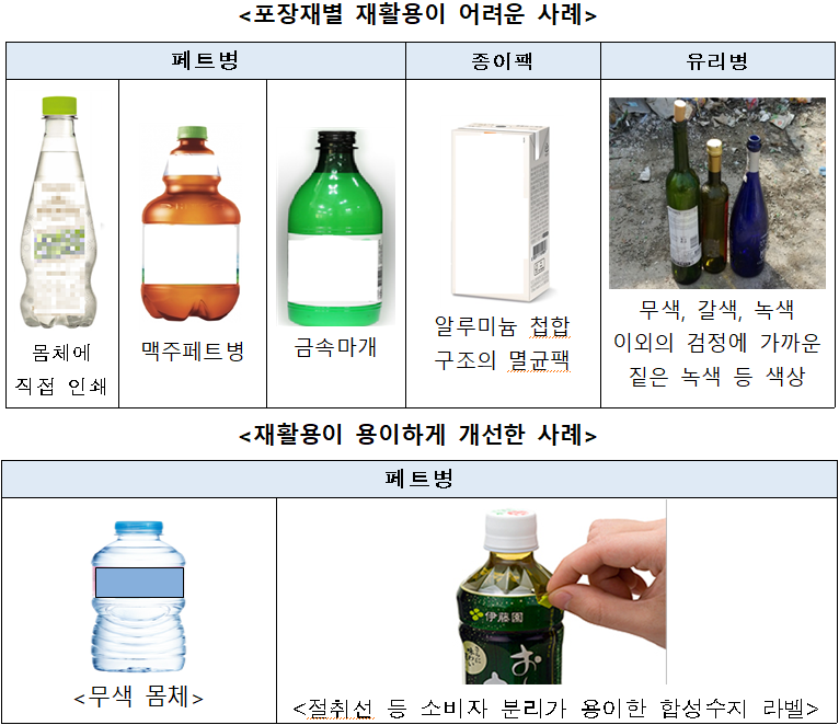 이에 따라, 2020년부터 음료·생수병용으로 생산되는 페트병은 유색에서 무색으로, 라벨의 일반접착제는 비접착식 또는 열알칼리성분리접착제 방식으로 단계적으로 전환될 것으로 보인다.