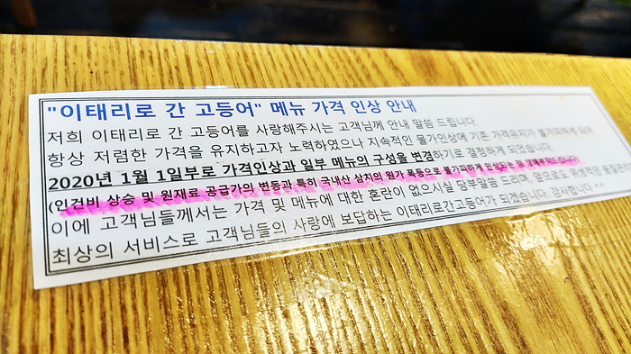 "이태리로 간 고등어" 메뉴 가격 인상 안내