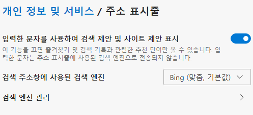 Edge 브라우저 주소표시창의 기본 검색엔진은 bing 이다.